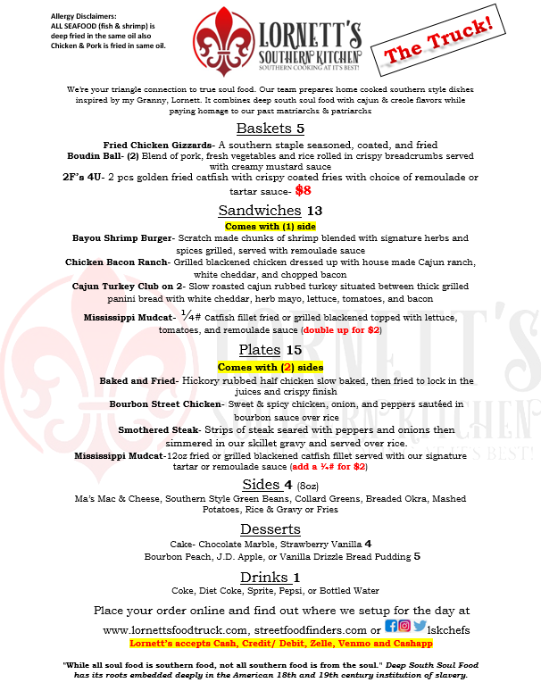 We’re your triangle connection to true soul food. Our team prepares home cooked southern style dishes inspired by my Granny, Lornett. It combines deep south soul food with cajun & creole flavors while paying homage to our past matriarchs & patriarchs