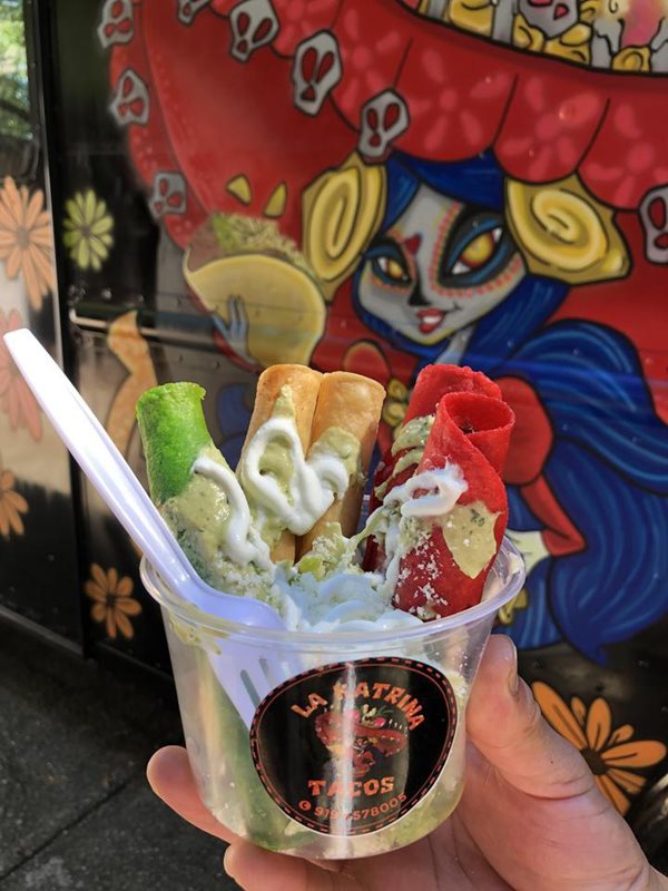 La Katrina food truck delivers an unforgettable culinary experience with their signature dish, the Katrina Cup. This culinary masterpiece features five crispy taquitos filled with tender chicken, topped with creamy avocado sauce, crisp lettuce, tangy sour cream, zesty pico de gallo, and crumbled cotija cheese. Reviewers rave about the mouthwatering guacamole and the flavorful Carne Asada tacos, promising a return visit and spreading the word about this must-try food truck!