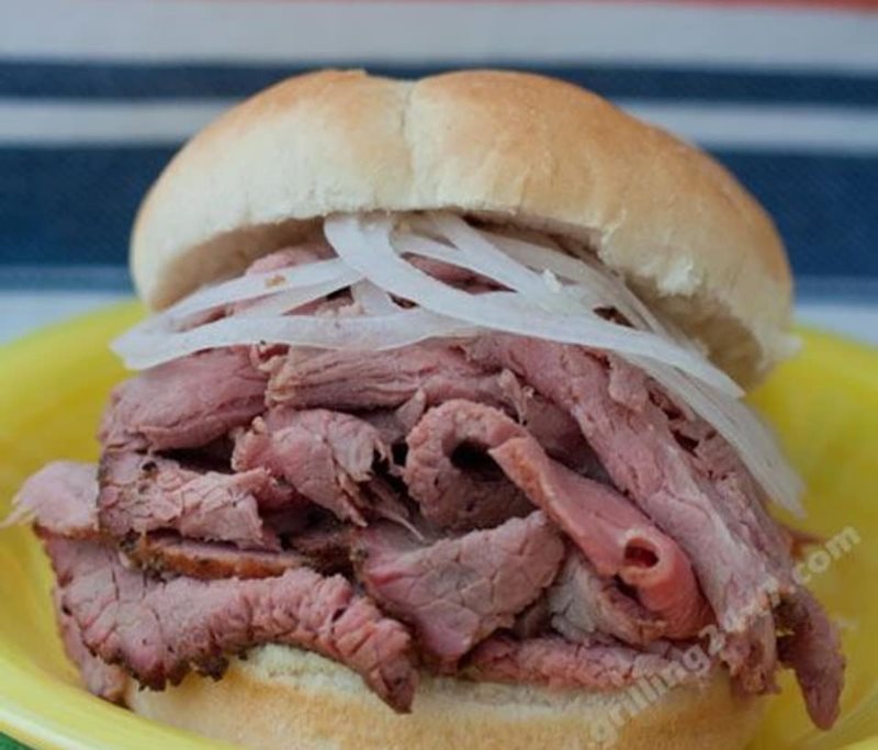Bottom round, slow cooked, dry rub, sliced.