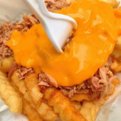 Bed of seasoned crinkle cut fries topped with a scoop of Chick-N-Que and melted cheddar.