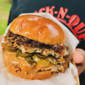 Smoked chicken filet with pickled jalapenos, pepper jack cheese, romaine lettuce, and tomato. Served with or without bun for a gluten-free option. (gf/spicy)